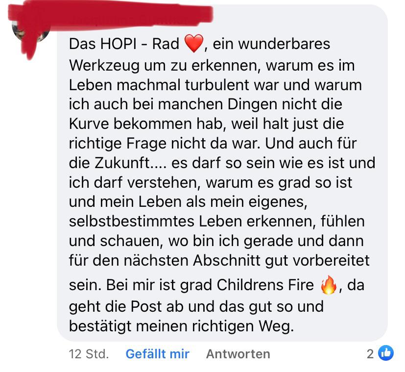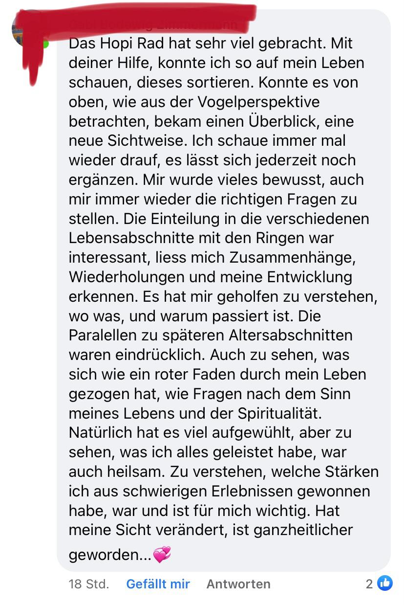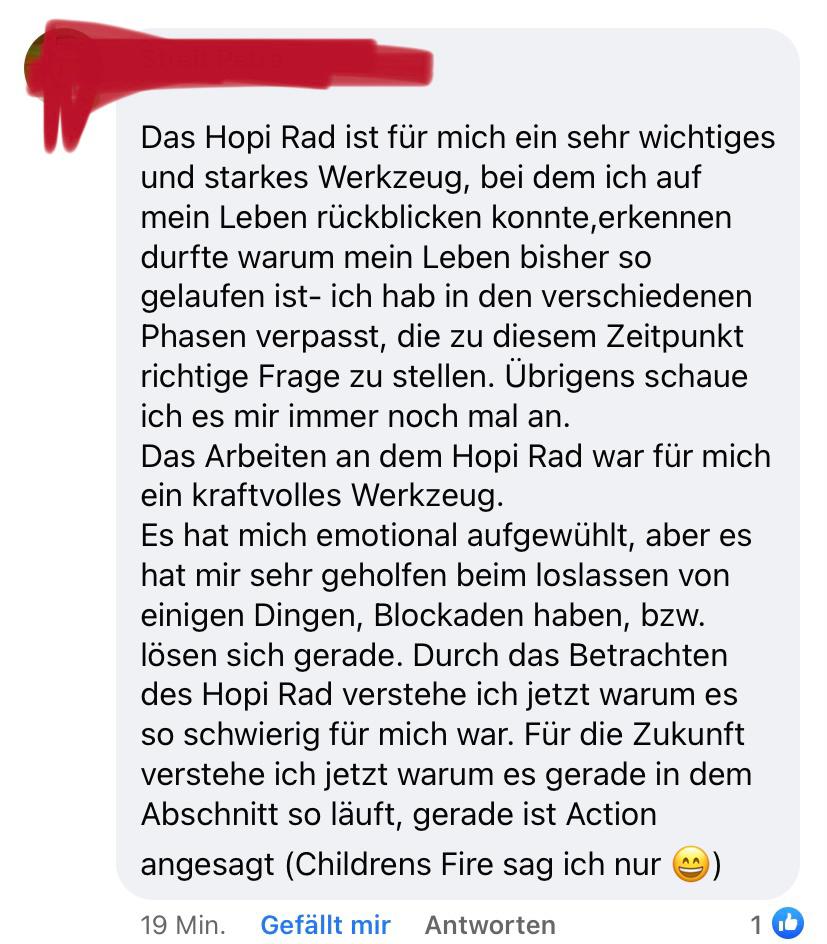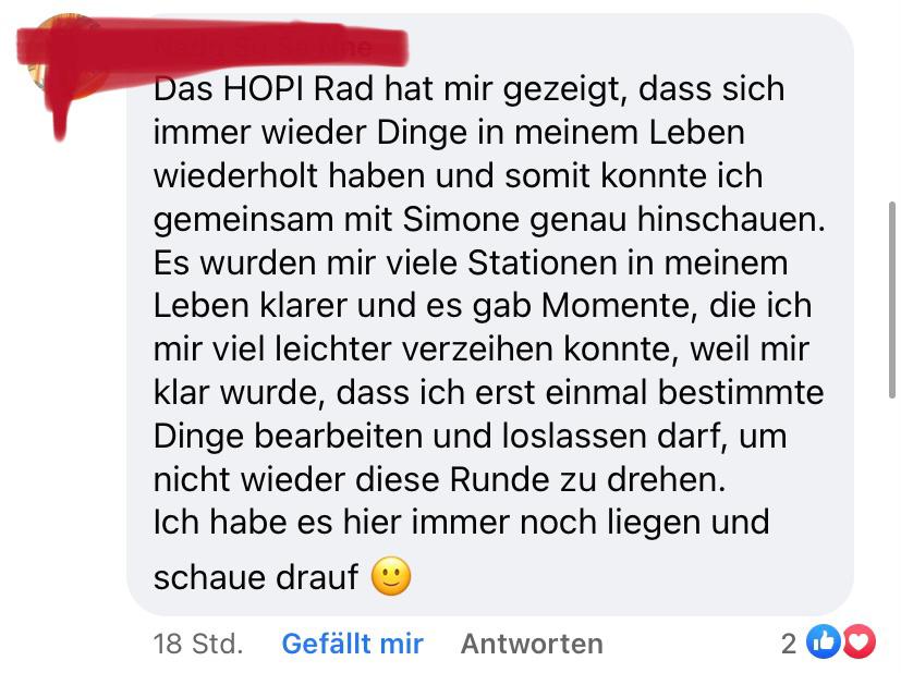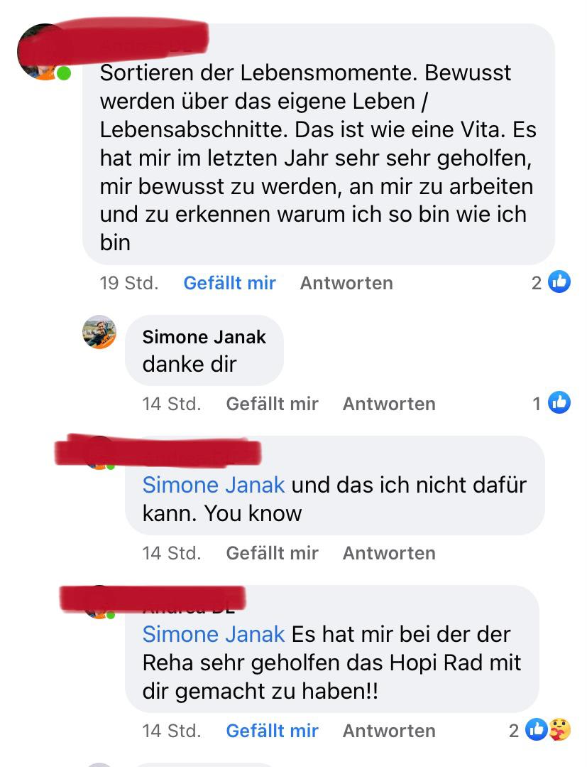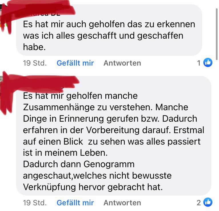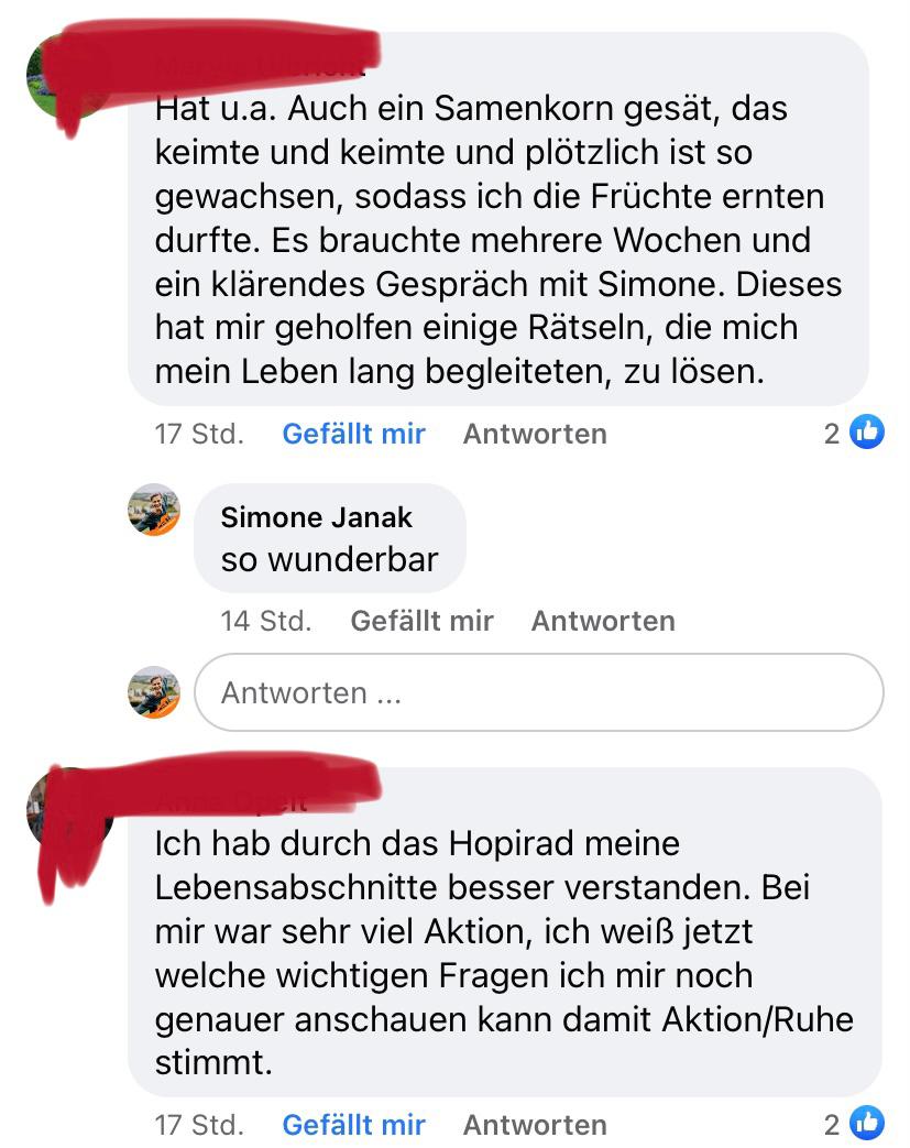 „Wir haben einiges Privates zusammen aufgearbeitet und dadurch viel Klarheit geschaffen für die nächsten Schritte. Die Bilder und Analogien, die wir besprochen haben sind im Gedächtnis geblieben und helfen nun auch in Zukunft im Handeln zu bleiben!“